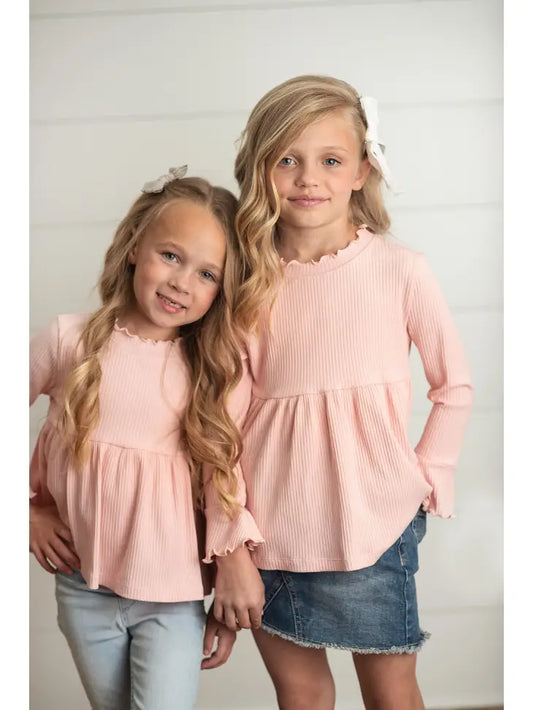 Blush Pink Long Sleeve Lettuce Trim Ribbed Shirt