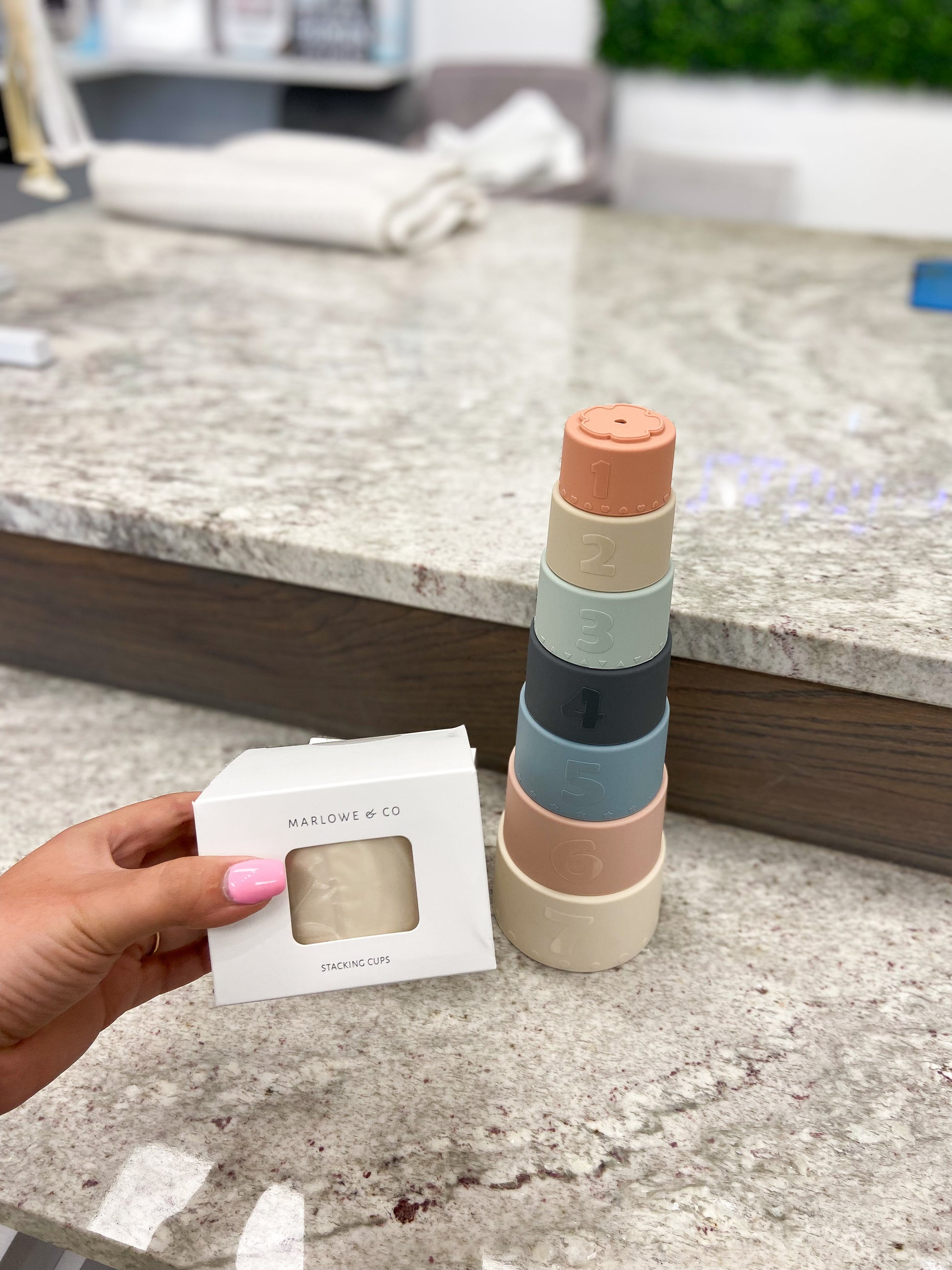 Marlowe & Co's Silicone stacking cups are modern and timeless. Our 7 piece stacking cups are thoughtfully designed with love and care. They are available in colors classic and retro, and are perfect for the modern family. Our cups feature 7 unique designs on the cups: a Rainbow, cupcake, unicorn, Dinosaur, Cactus, Cherry, and a flower.