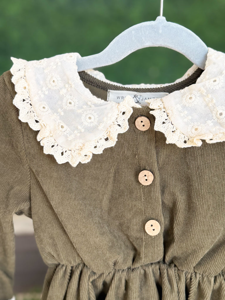 Girls Olive Green Corduroy & Lace Bell Sleeve Fall Dress