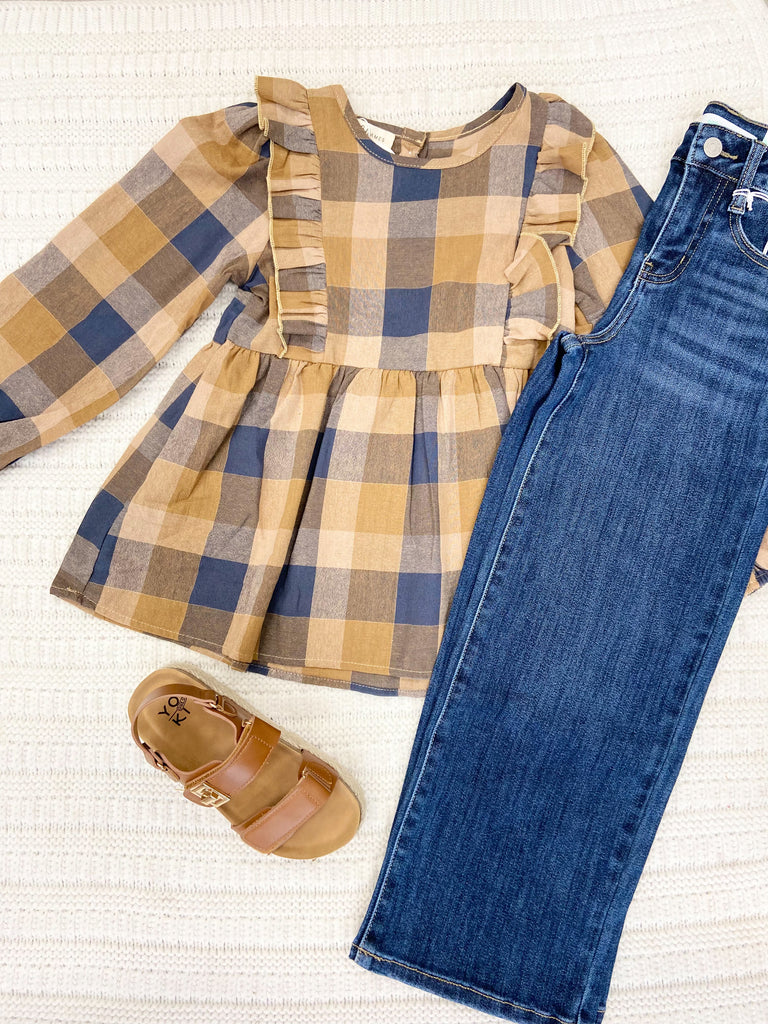 Girls Mustard & Gray Plaid Ruffle Button Top