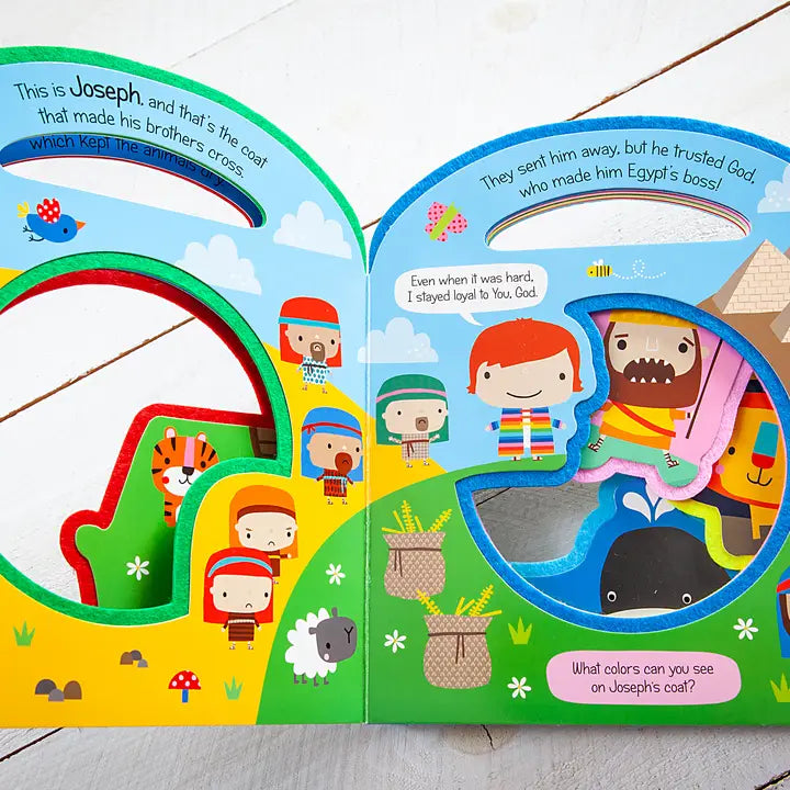 - The book has peek-through pages, each lined with felt, providing children with a multi-sensory experience. A carry handle makes it perfect for taking God’s Word with you wherever you go.
